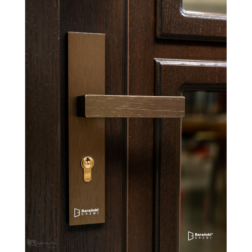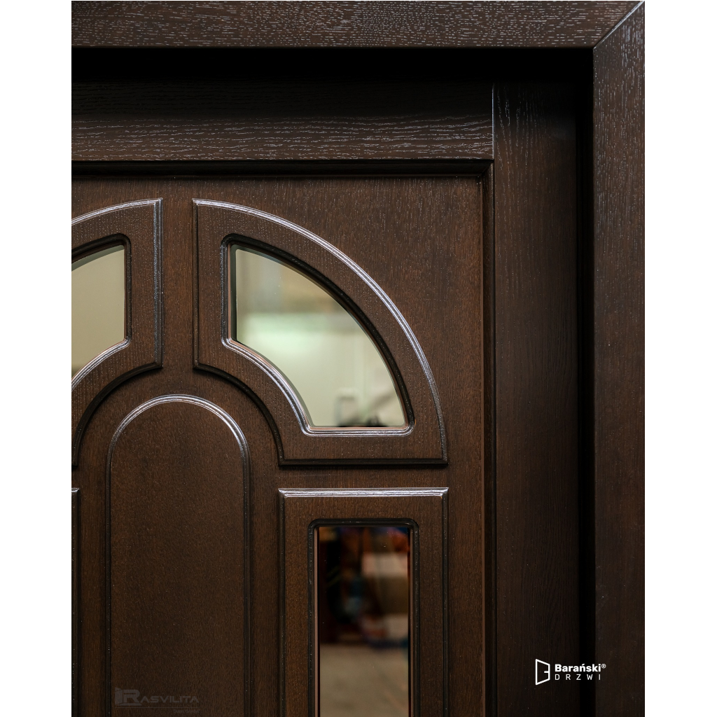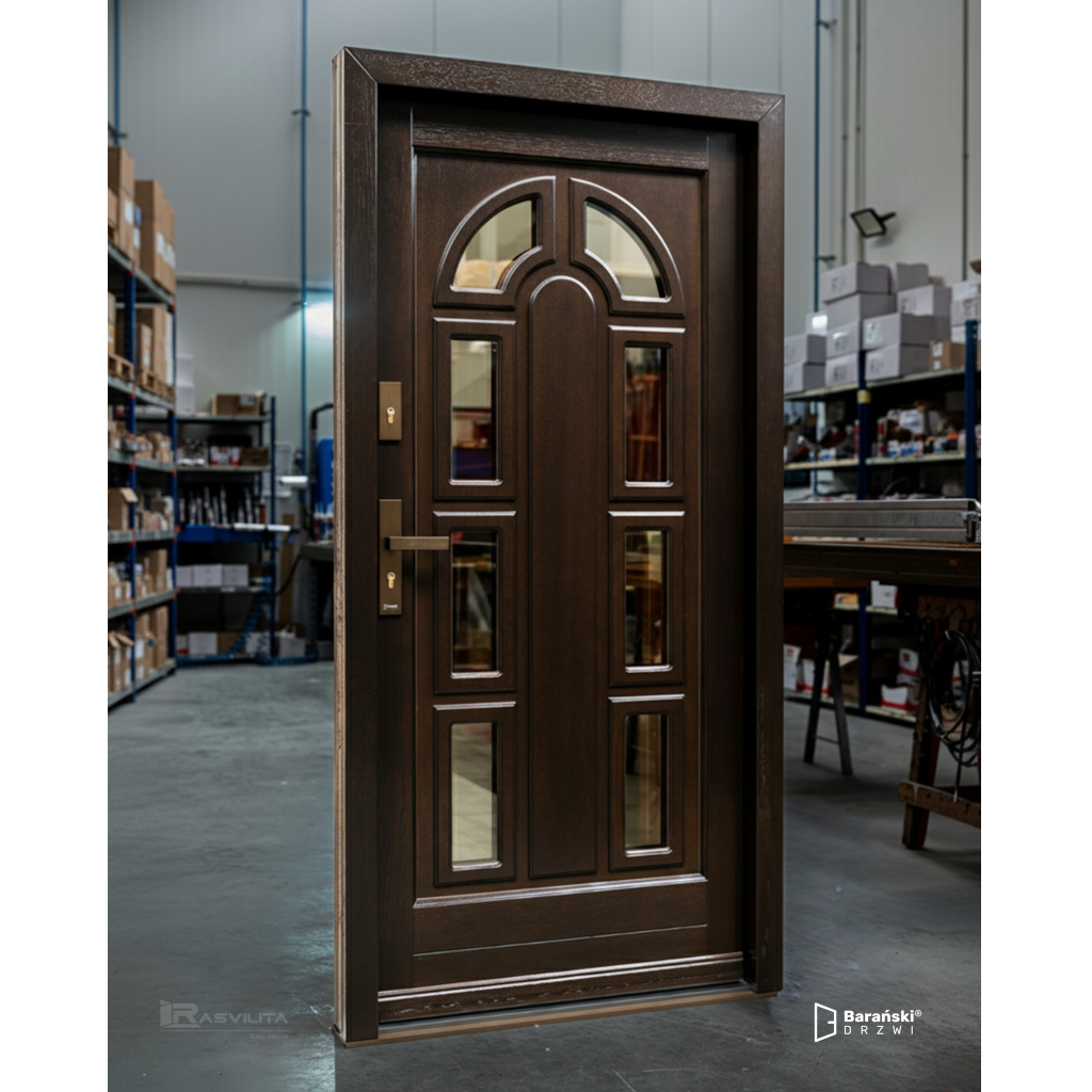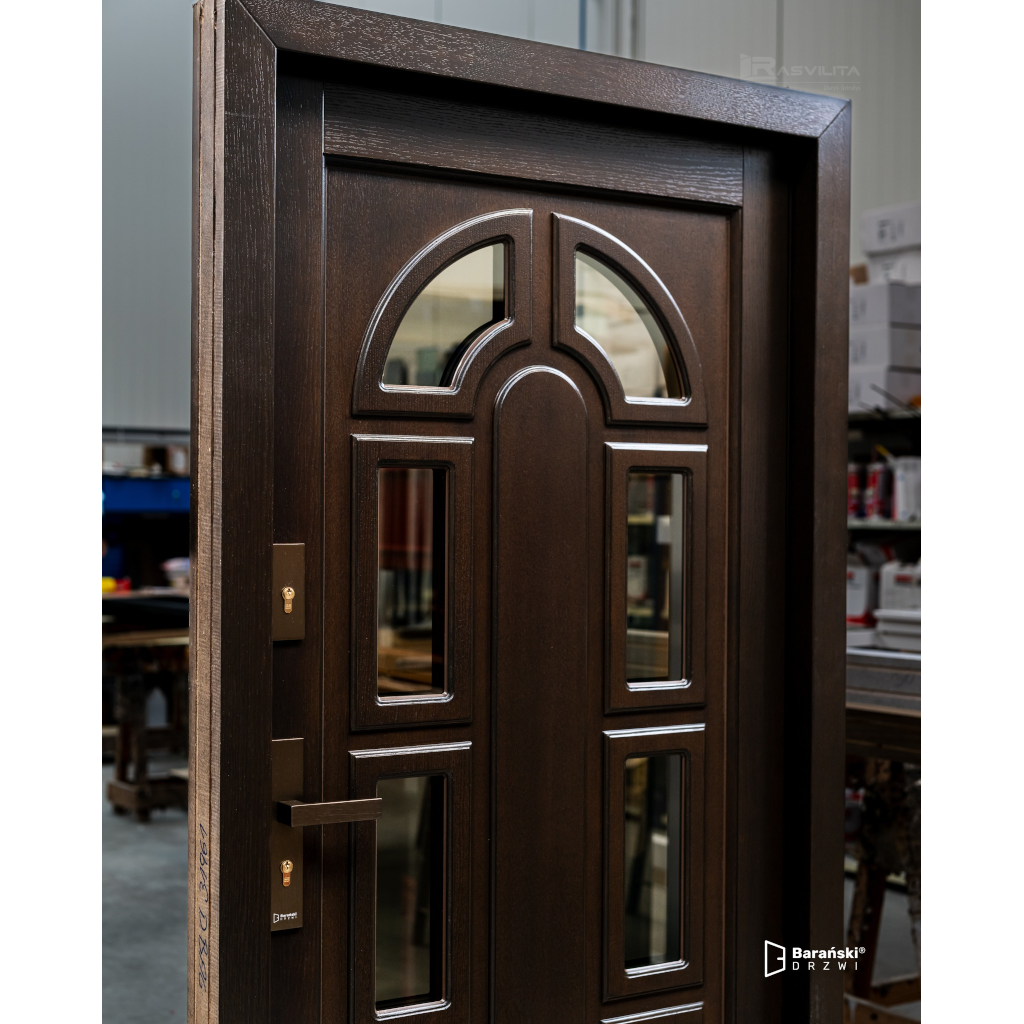 Baranski lauko durų individualus projektas. Durys - stiklo konstrukcija. Baranski lauko durų individualus projektas. Veidrodiniai stiklo paketai. Gaubianti medinė stakta su durų apvadais. Yra kataloge. Baranski lauko durų individualus projektas. Stiklo dekoro stakta, stiklo dekoro švieslangis bei varčios dalis. Išilginė stačiakampė rankena. Baranski lauko durų individualus projektas. Durys veidrodis.