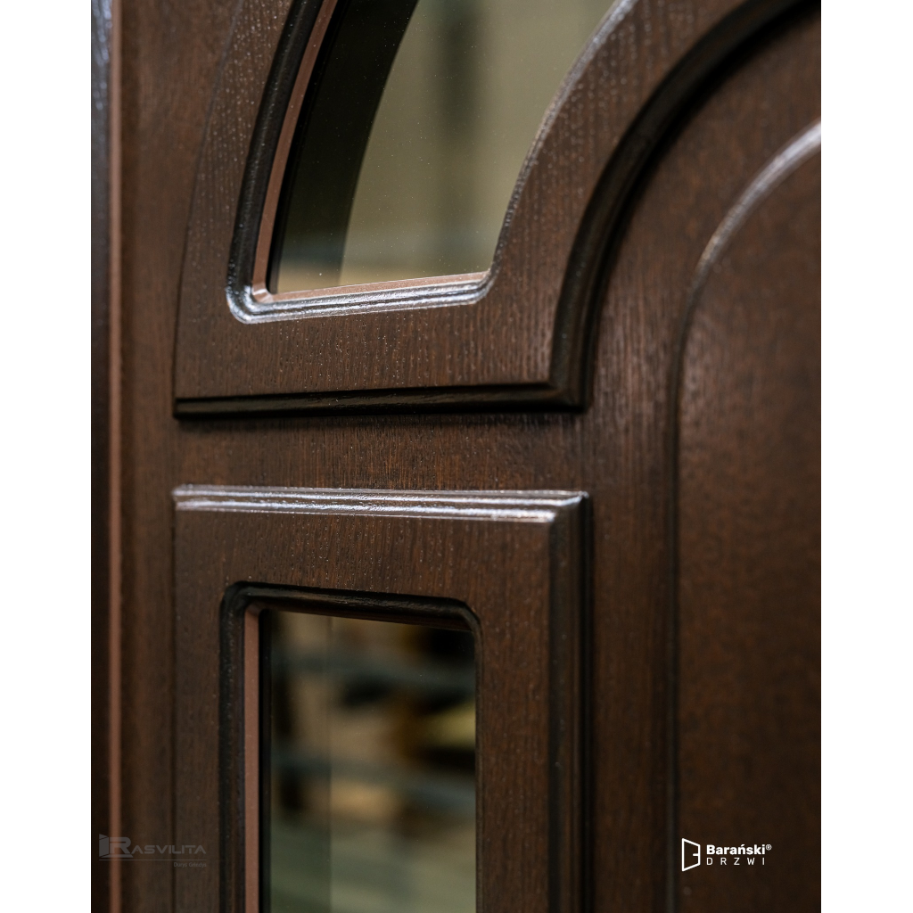 Baranski lauko durų individualus projektas. Arkinis durų kampas. Veidrodiniai stiklo paketai. Išilginė stačiakampė "Antaba" rankena. Baranski lauko durų individualus projektas. Arkinė durų konstrukcija su šaliduriais ir viršlangiais. Veidrodiniai stiklo paketai. Baranski lauko durų individualus projektas. Geltona matinė RAL paletės spalva. Stiklo dekoro stakta su stiklo dekoro švieslangiu ir "refleks" stiklo paketu. Baranski lauko durų individualus projektas. Simetriškos dvivėrės durys su ornamentais. Matiniai stiklo paketai.